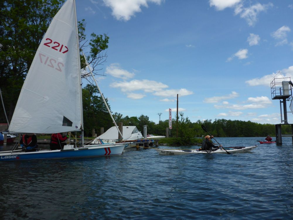 - Schweriner Außensee, Kanutin schleppt Segelboot ab